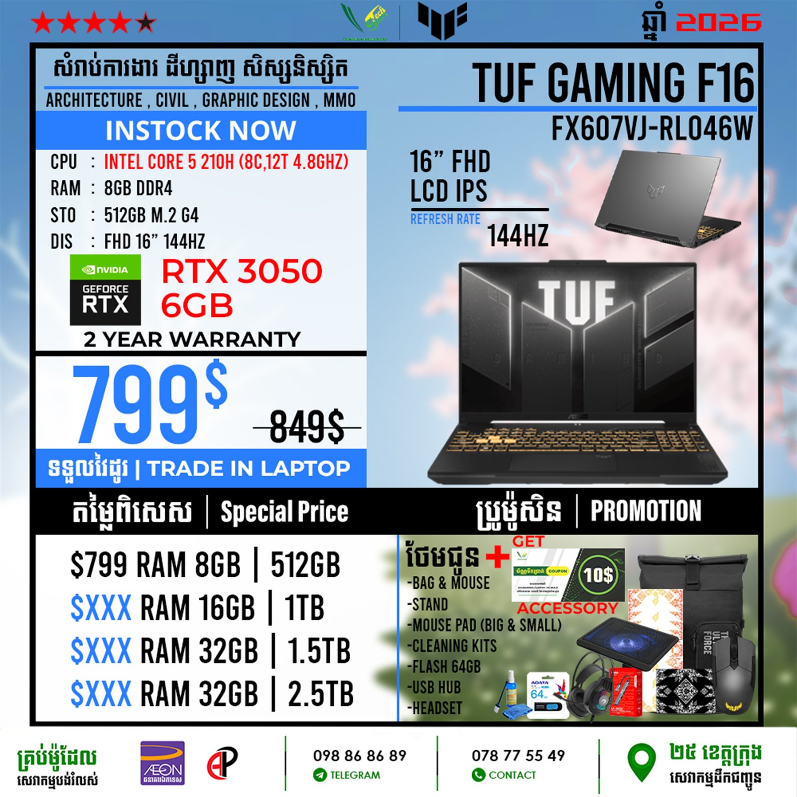 | 2 Years Hardware (Motherboard) 1 Year for screen, Keyboard 6 Month battery ផលិតផលថ្មី 100% ធានាពីក្រុមហ៊ុន ================================ ទិញភ្លាម បានភ្លាមបងៗ មានស្តុកស្រាប់ ================================ ធ្វើការបញ្ជាទិញតាមប្រព័ន្ធ Online | ដឹកជញ្ជូនគ្រប់ខេត្ត Call: 098 86 86 89 Facebook: V-Store Center Telegram: 078 775 549 |
