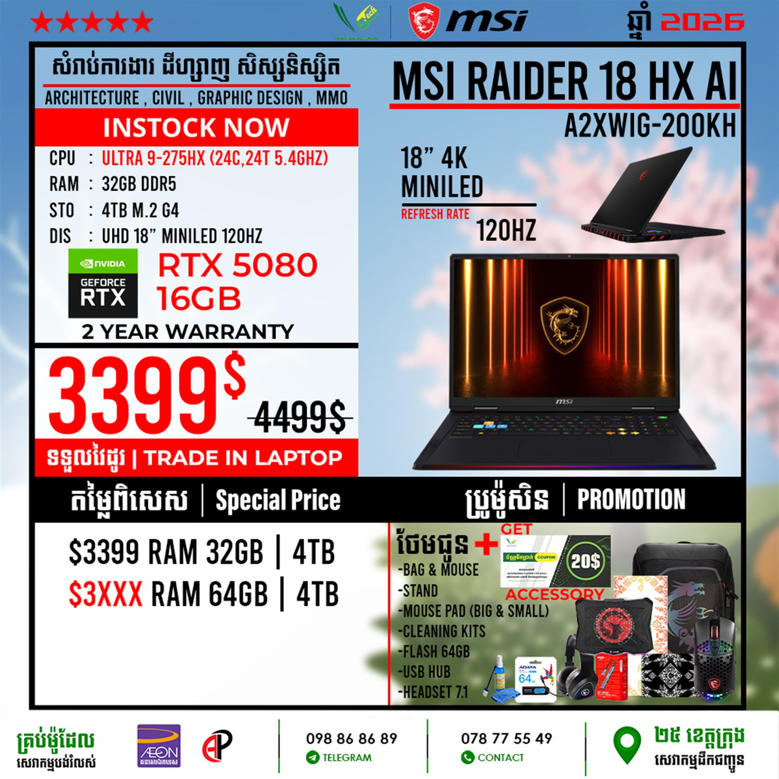 | 2 Years Hardware (Motherboard) 1 Year for screen, Keyboard 6 Month battery ផលិតផលថ្មី 100% ធានាពីក្រុមហ៊ុន ================================ ទិញភ្លាម បានភ្លាមបងៗ មានស្តុកស្រាប់ ================================ ធ្វើការបញ្ជាទិញតាមប្រព័ន្ធ Online | ដឹកជញ្ជូនគ្រប់ខេត្ត Call: 098 86 86 89 Facebook: V-Store Center Telegram: 078 775 549 |