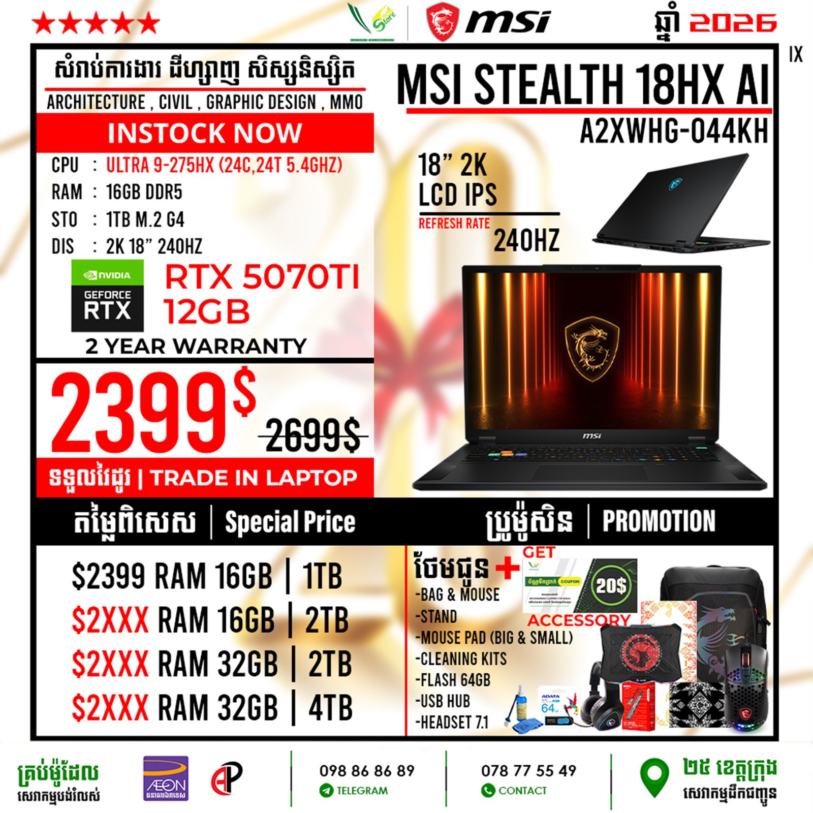 | 2 Years Hardware (Motherboard) 1 Year for screen, Keyboard 6 Month battery ផលិតផលថ្មី 100% ធានាពីក្រុមហ៊ុន ================================ ទិញភ្លាម បានភ្លាមបងៗ មានស្តុកស្រាប់ ================================ ធ្វើការបញ្ជាទិញតាមប្រព័ន្ធ Online | ដឹកជញ្ជូនគ្រប់ខេត្ត Call: 098 86 86 89 Facebook: V-Store Center Telegram: 078 775 549 |