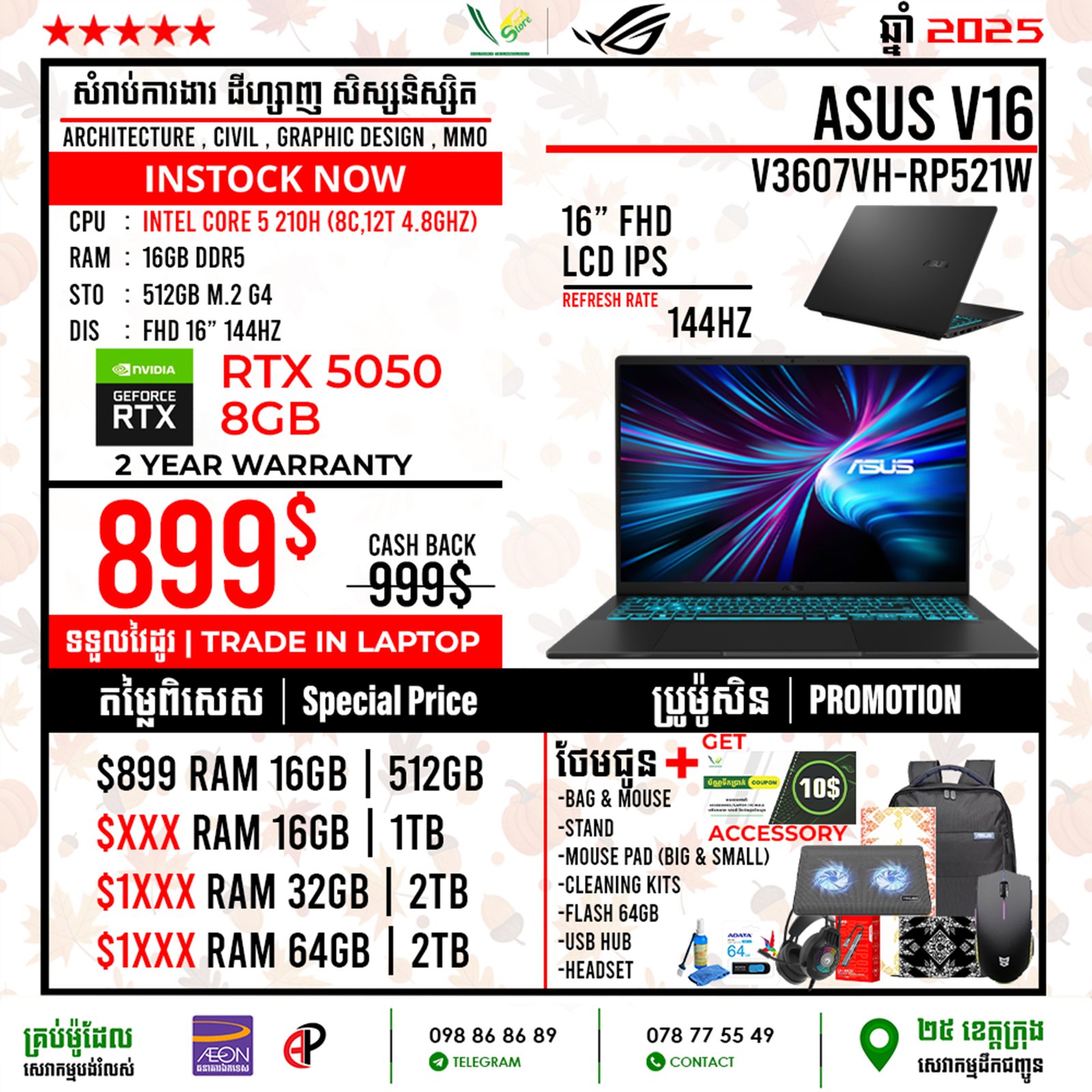 | 2 Years Hardware (Motherboard) 1 Year for screen, Keyboard 6 Month battery ផលិតផលថ្មី 100% ធានាពីក្រុមហ៊ុន ================================ ទិញភ្លាម បានភ្លាមបងៗ មានស្តុកស្រាប់ ================================ ធ្វើការបញ្ជាទិញតាមប្រព័ន្ធ Online | ដឹកជញ្ជូនគ្រប់ខេត្ត Call: 098 86 86 89 Facebook: V-Store Center Telegram: 078 775 549 |