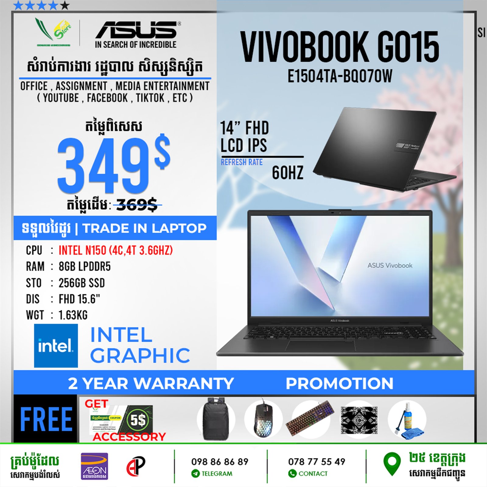 | 2 Years Hardware (Motherboard) 1 Year for screen, Keyboard 6 Month battery ផលិតផលថ្មី 100% ធានាពីក្រុមហ៊ុន ================================ ទិញភ្លាម បានភ្លាមបងៗ មានស្តុកស្រាប់ ================================ ធ្វើការបញ្ជាទិញតាមប្រព័ន្ធ Online | ដឹកជញ្ជូនគ្រប់ខេត្ត Call: 098 86 86 89 Facebook: V-Store Center Telegram: 078 775 549 |