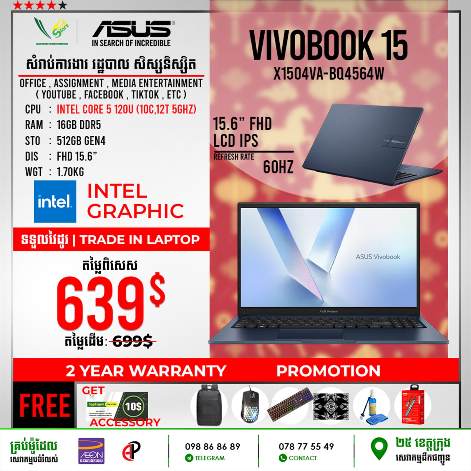 | 2 Years Hardware (Motherboard) 1 Year for screen, Keyboard 6 Month battery ផលិតផលថ្មី 100% ធានាពីក្រុមហ៊ុន ================================ ទិញភ្លាម បានភ្លាមបងៗ មានស្តុកស្រាប់ ================================ ធ្វើការបញ្ជាទិញតាមប្រព័ន្ធ Online | ដឹកជញ្ជូនគ្រប់ខេត្ត Call: 098 86 86 89 Facebook: V-Store Center Telegram: 078 775 549 |