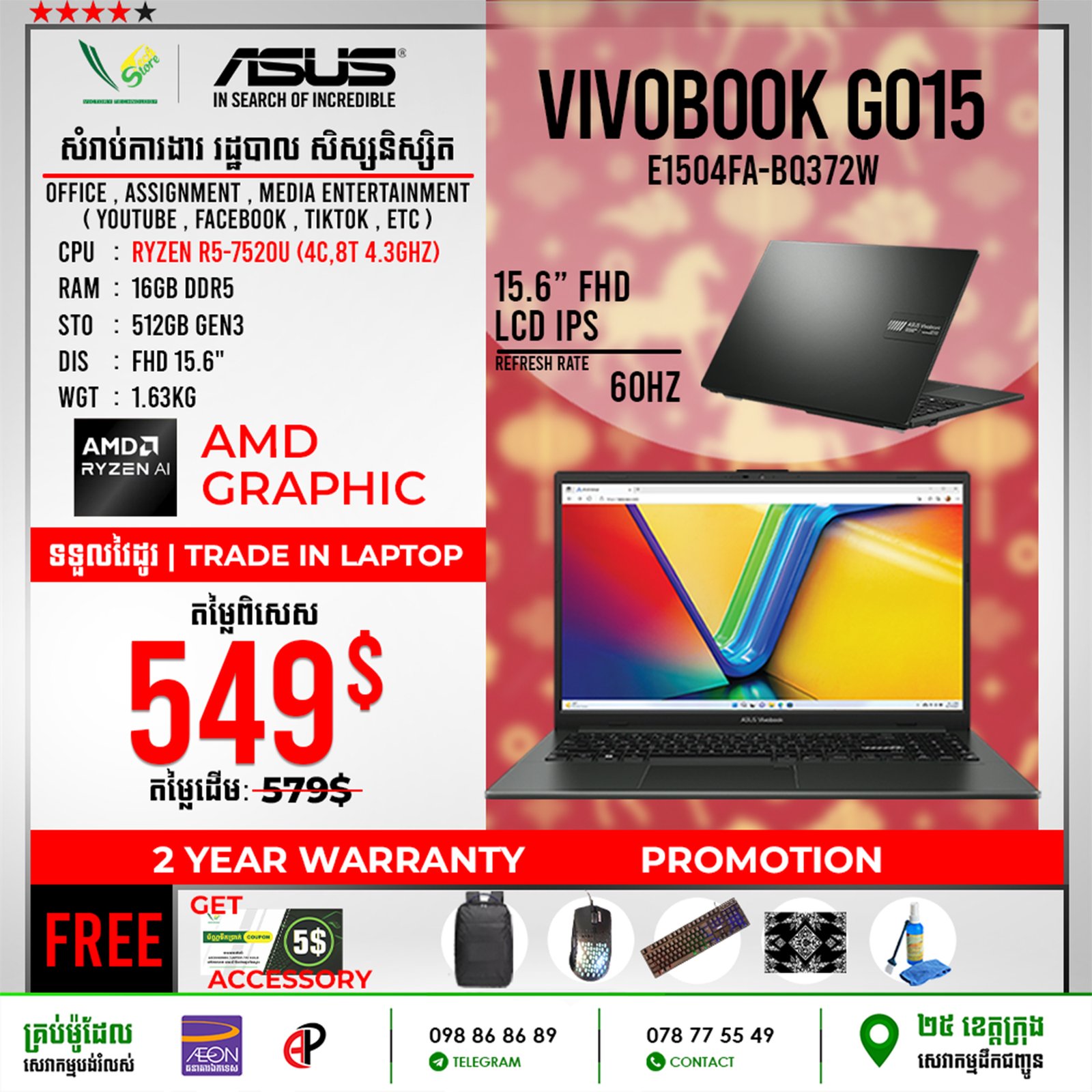 | +Free Accessory -Backpack -Mouse -Keyboard -Mousepad -Cleaning Kit -Coupon 5$ |