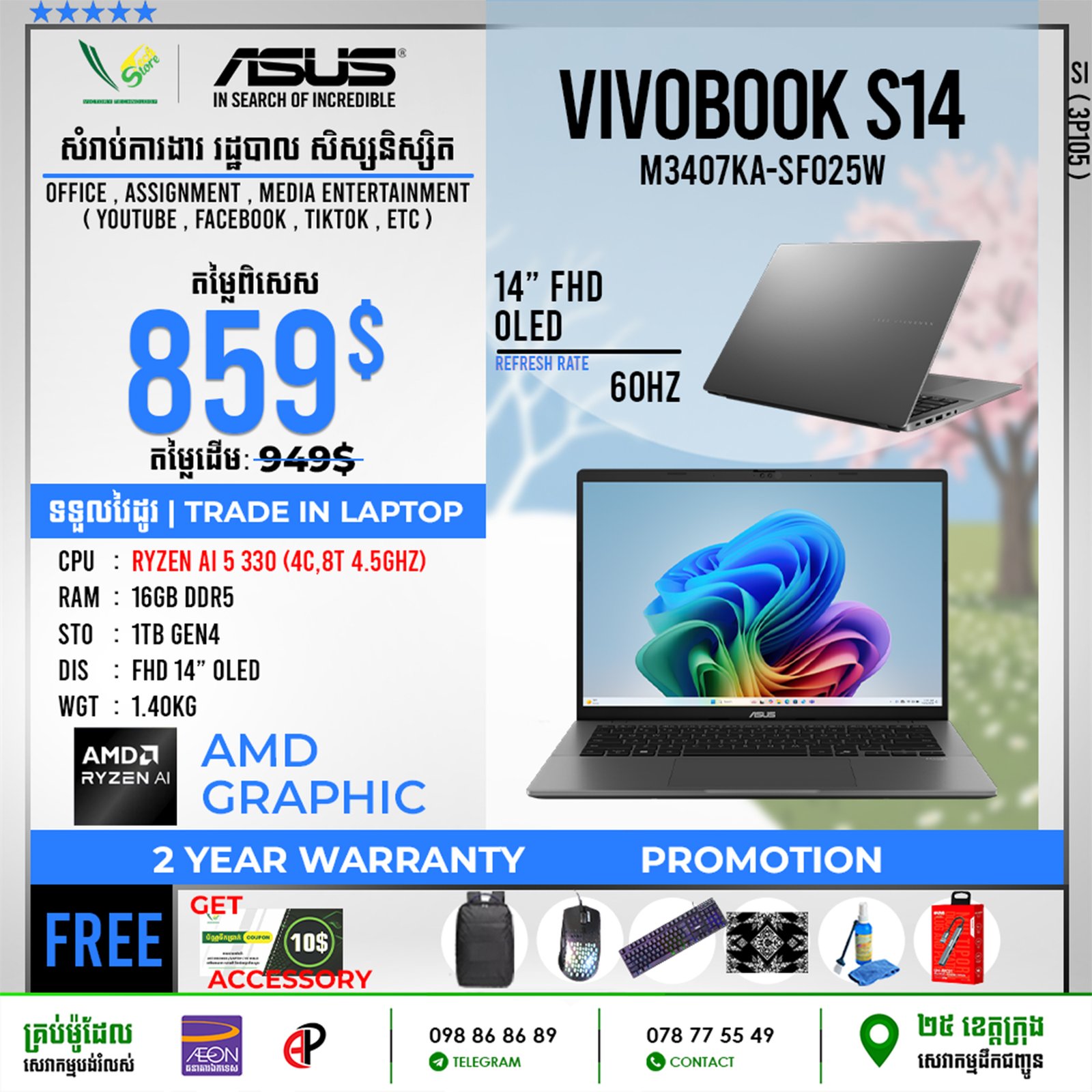 | 2 Years Hardware (Motherboard) 1 Year for screen, Keyboard 6 Month battery ផលិតផលថ្មី 100% ធានាពីក្រុមហ៊ុន ================================ ទិញភ្លាម បានភ្លាមបងៗ មានស្តុកស្រាប់ ================================ ធ្វើការបញ្ជាទិញតាមប្រព័ន្ធ Online | ដឹកជញ្ជូនគ្រប់ខេត្ត Call: 098 86 86 89 Facebook: V-Store Center Telegram: 078 775 549 |