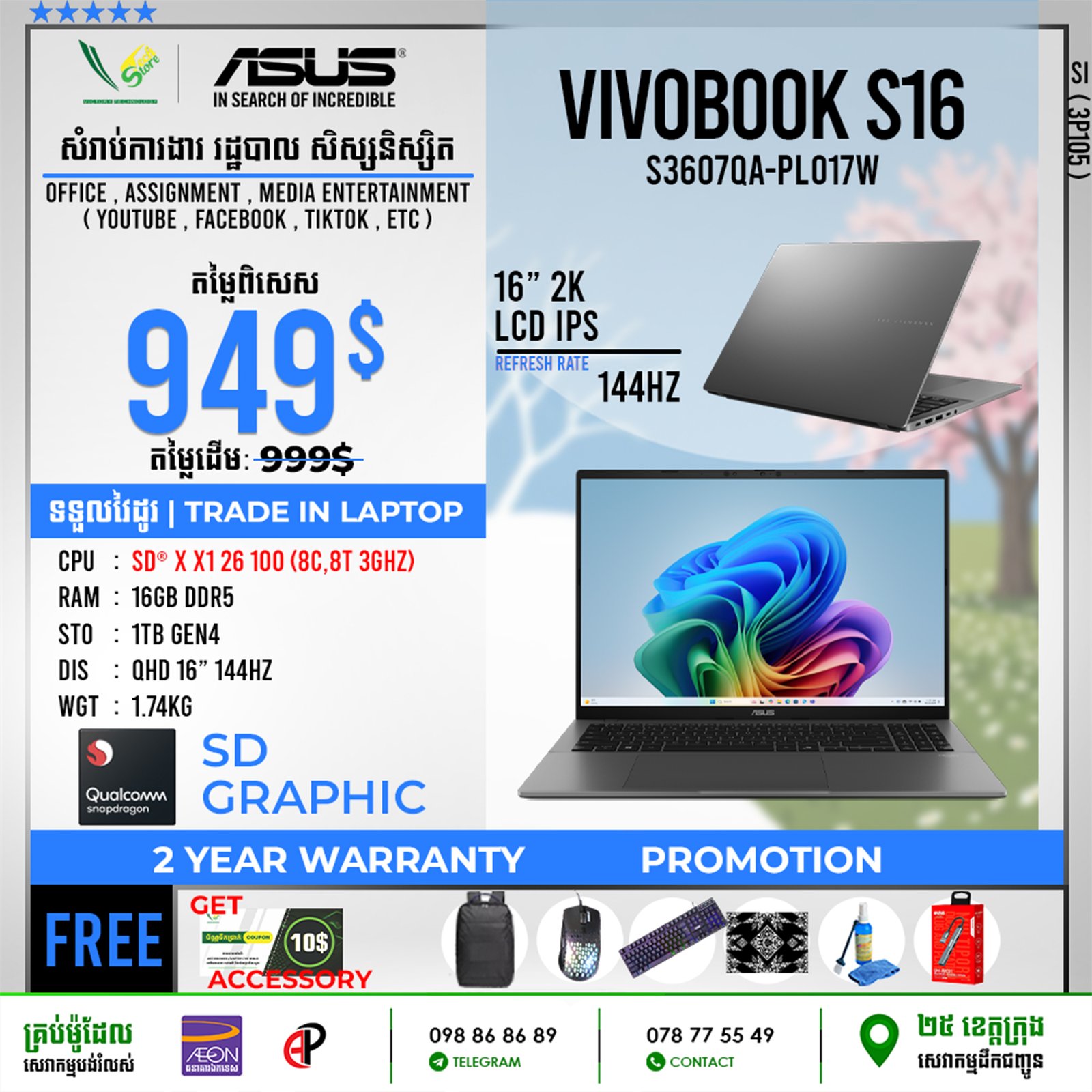 | 2 Years Hardware (Motherboard) 1 Year for screen, Keyboard 6 Month battery ផលិតផលថ្មី 100% ធានាពីក្រុមហ៊ុន ================================ ទិញភ្លាម បានភ្លាមបងៗ មានស្តុកស្រាប់ ================================ ធ្វើការបញ្ជាទិញតាមប្រព័ន្ធ Online | ដឹកជញ្ជូនគ្រប់ខេត្ត Call: 098 86 86 89 Facebook: V-Store Center Telegram: 078 775 549 |