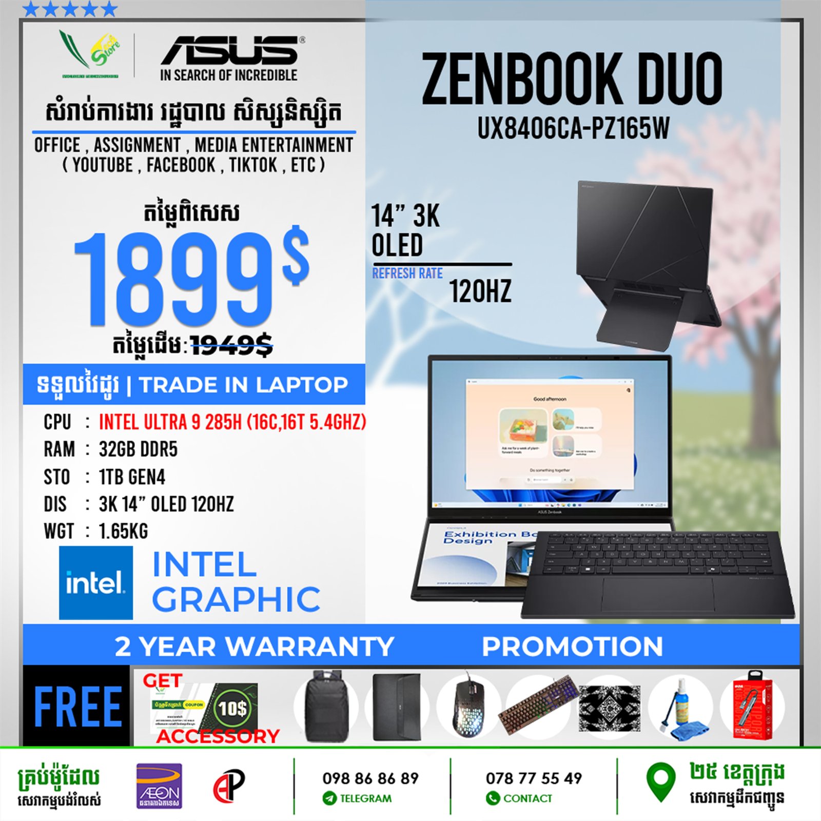 | 2 Years Hardware (Motherboard) 1 Year for screen, Keyboard 6 Month battery ផលិតផលថ្មី 100% ធានាពីក្រុមហ៊ុន ================================ ទិញភ្លាម បានភ្លាមបងៗ មានស្តុកស្រាប់ ================================ ធ្វើការបញ្ជាទិញតាមប្រព័ន្ធ Online | ដឹកជញ្ជូនគ្រប់ខេត្ត Call: 098 86 86 89 Facebook: V-Store Center Telegram: 078 775 549 |