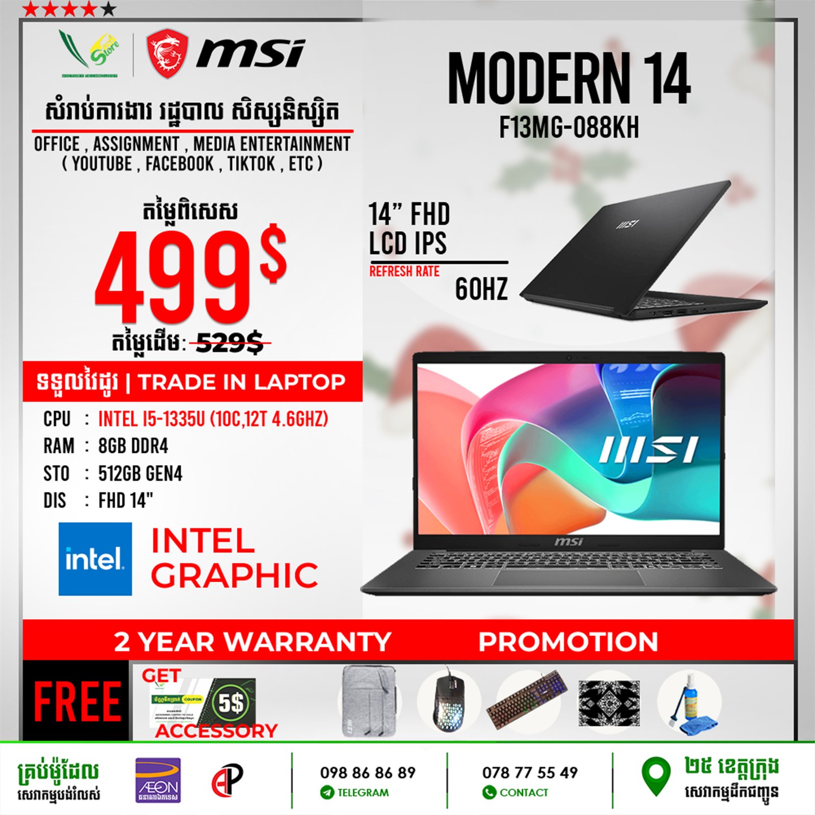 | 2 Years Hardware (Motherboard) 1 Year for screen, Keyboard 6 Month battery ផលិតផលថ្មី 100% ធានាពីក្រុមហ៊ុន ================================ ទិញភ្លាម បានភ្លាមបងៗ មានស្តុកស្រាប់ ================================ ធ្វើការបញ្ជាទិញតាមប្រព័ន្ធ Online | ដឹកជញ្ជូនគ្រប់ខេត្ត Call: 098 86 86 89 Facebook: V-Store Center Telegram: 078 775 549 |