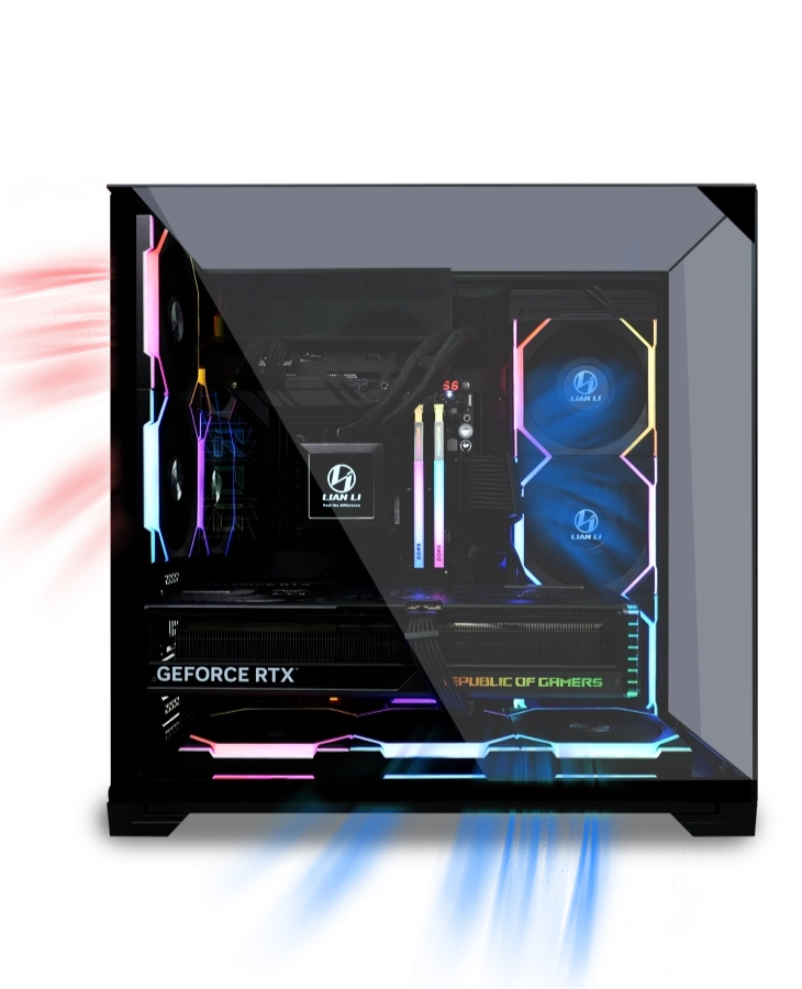 The Allure of Curved Glass Experiences Unwavering Tempered Glass Hardware Harmony with Dual Chamber Streamlined Cable Management Design Patented Side Fan Bracket Premium Mesh Panel Included.